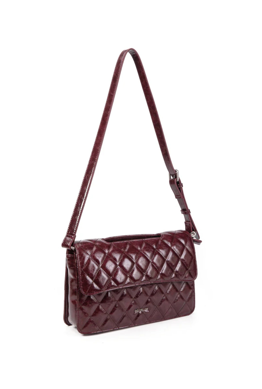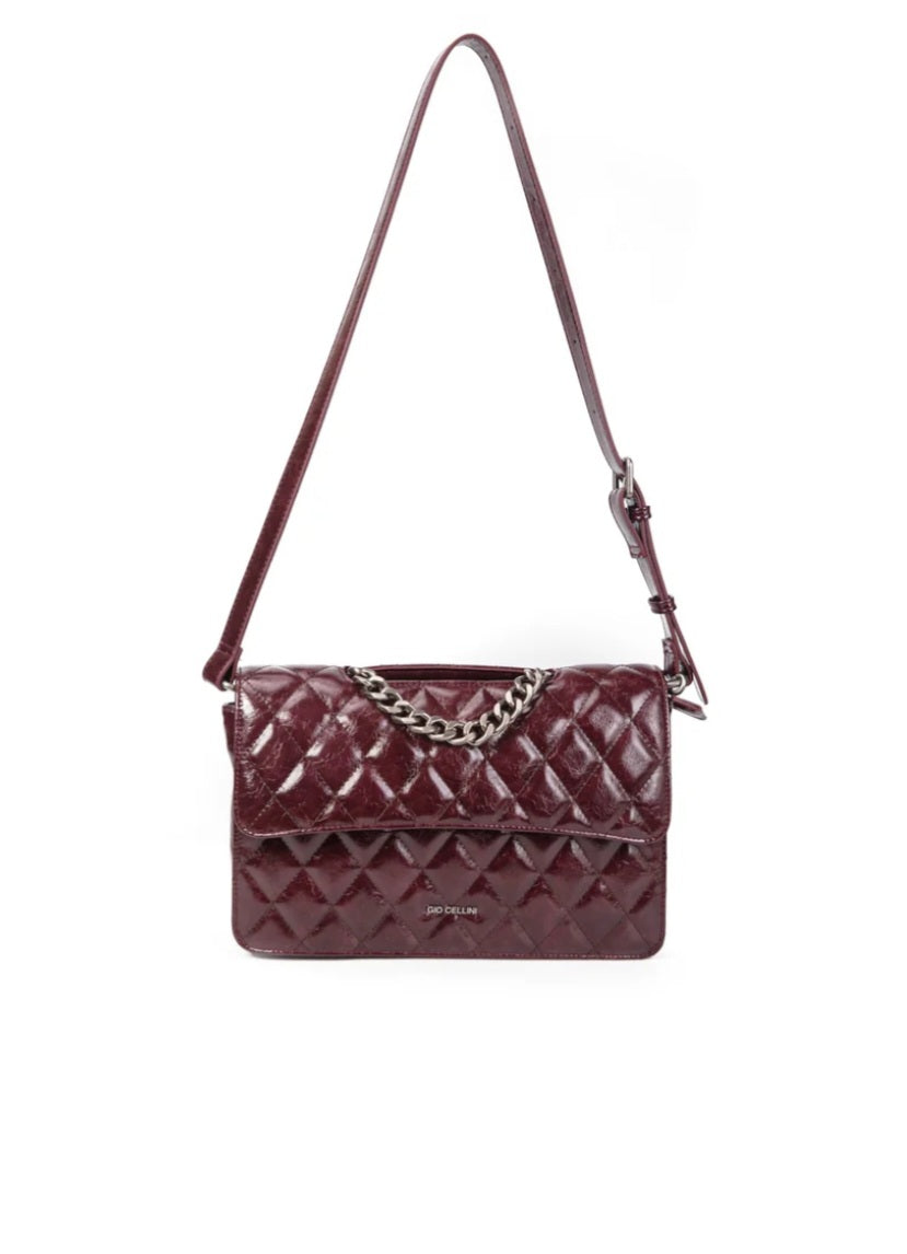 Borsa a spalla tre scomparti in ecopelle effetto vernice con logo lettering finitura argentata