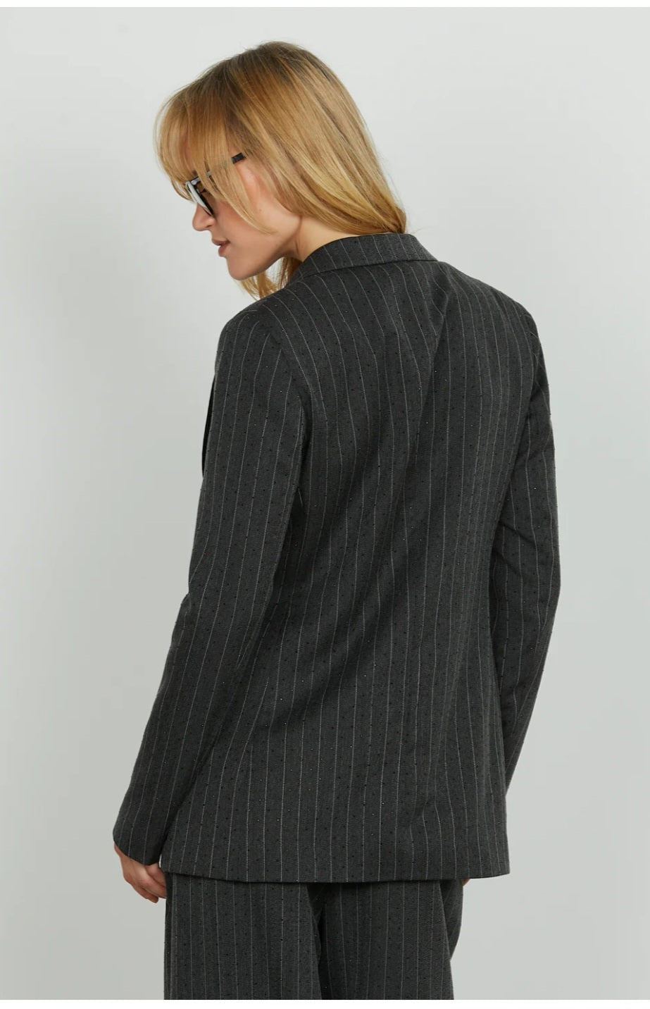 La giacca Mandra_S reinterpreta il gessato in chiave contemporanea: la linea lunga e il bottone singolo valorizzano la figura, mentre i brillantini delicati aggiungono un tocco di luce sofisticata. Un capo perfetto per chi ama distinguersi con stile e raffinatezza, senza rinunciare al carattere.