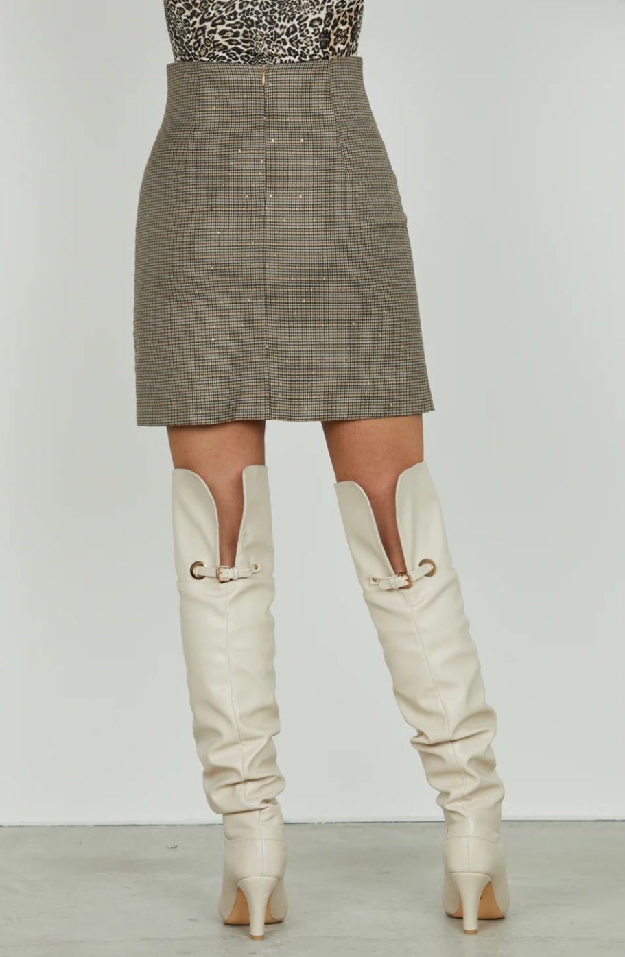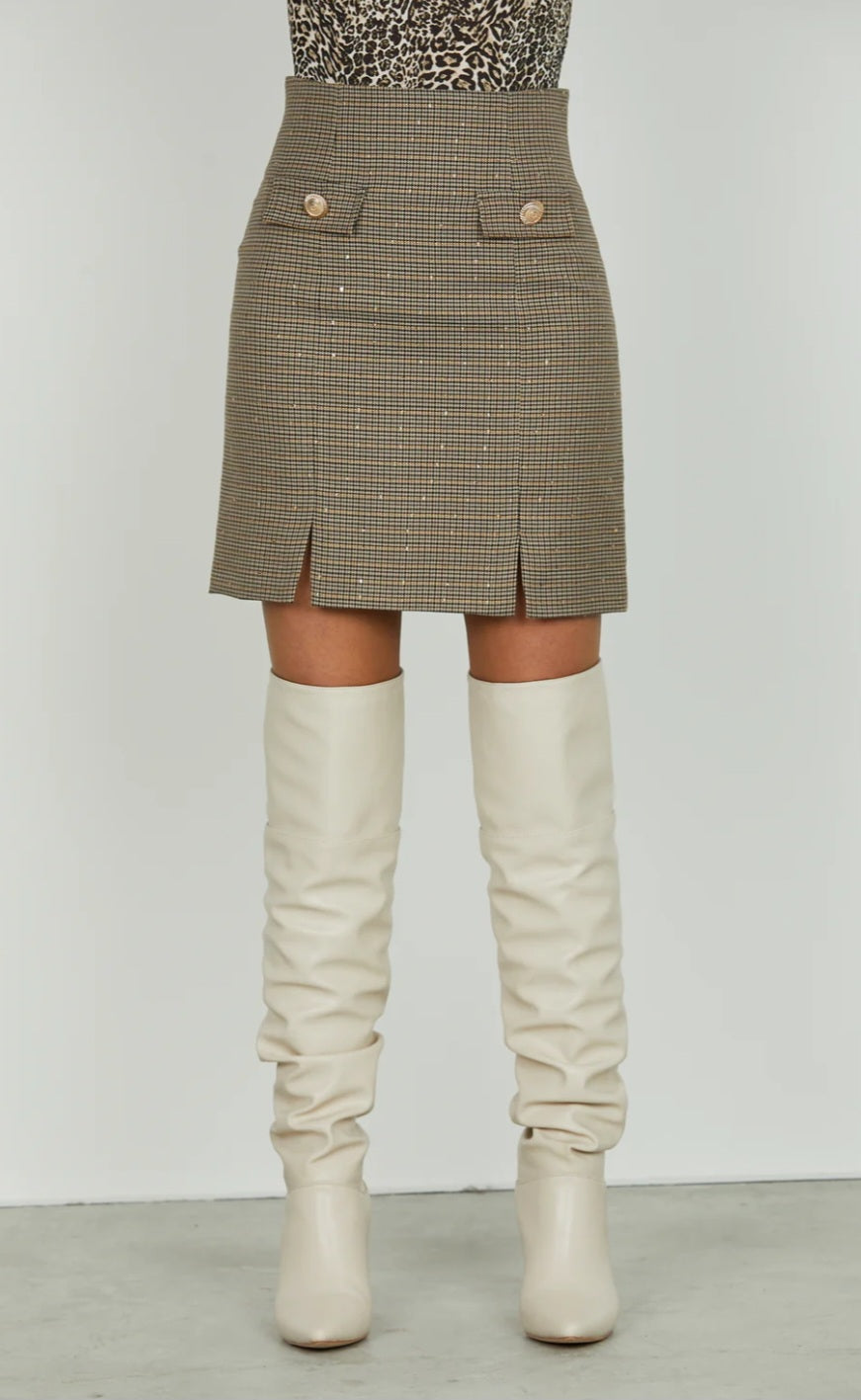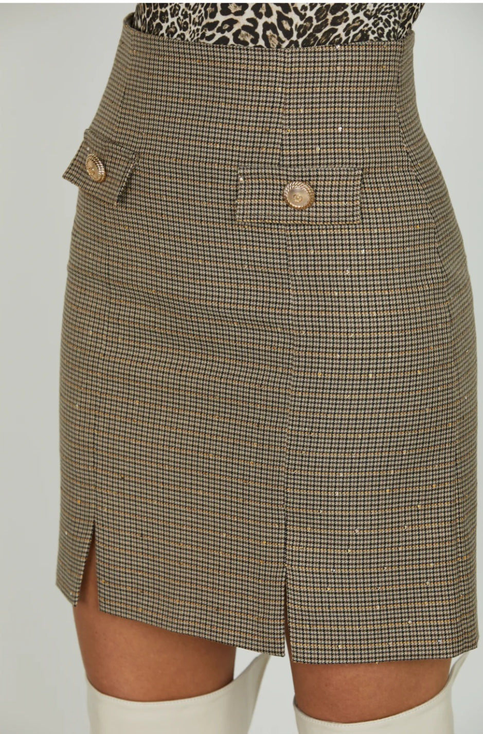 Gonna corta Fuji in micro pied de poule con luminose paillettes, arricchita da patte decorative e spacchetti sul fondo. Un capo moderno e grintoso, ideale per look chic e di tendenza.