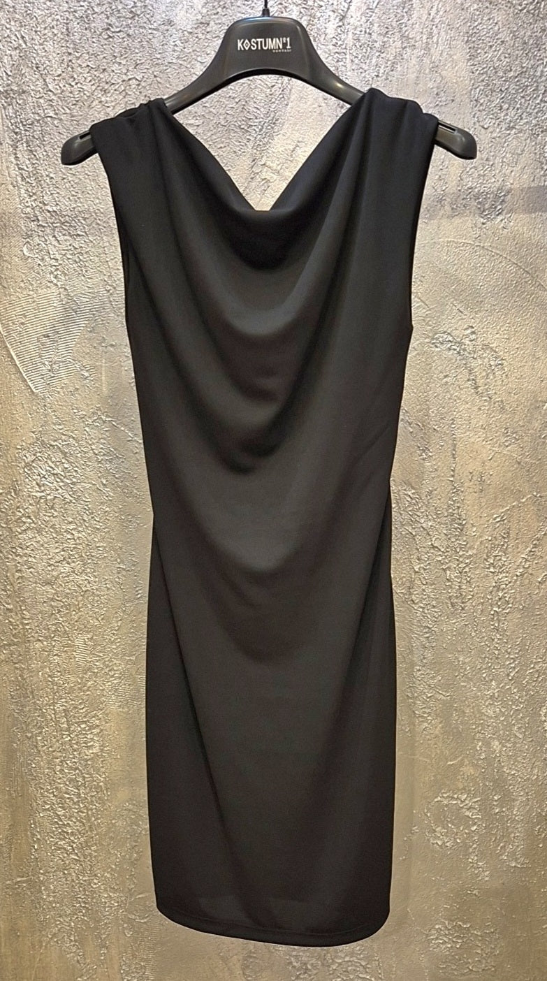 Mini dress senza maniche, con collo morbido sulla parte anteriore, ampia scollatura nella parte posteriore. L'abito rimane attillato e corto.
