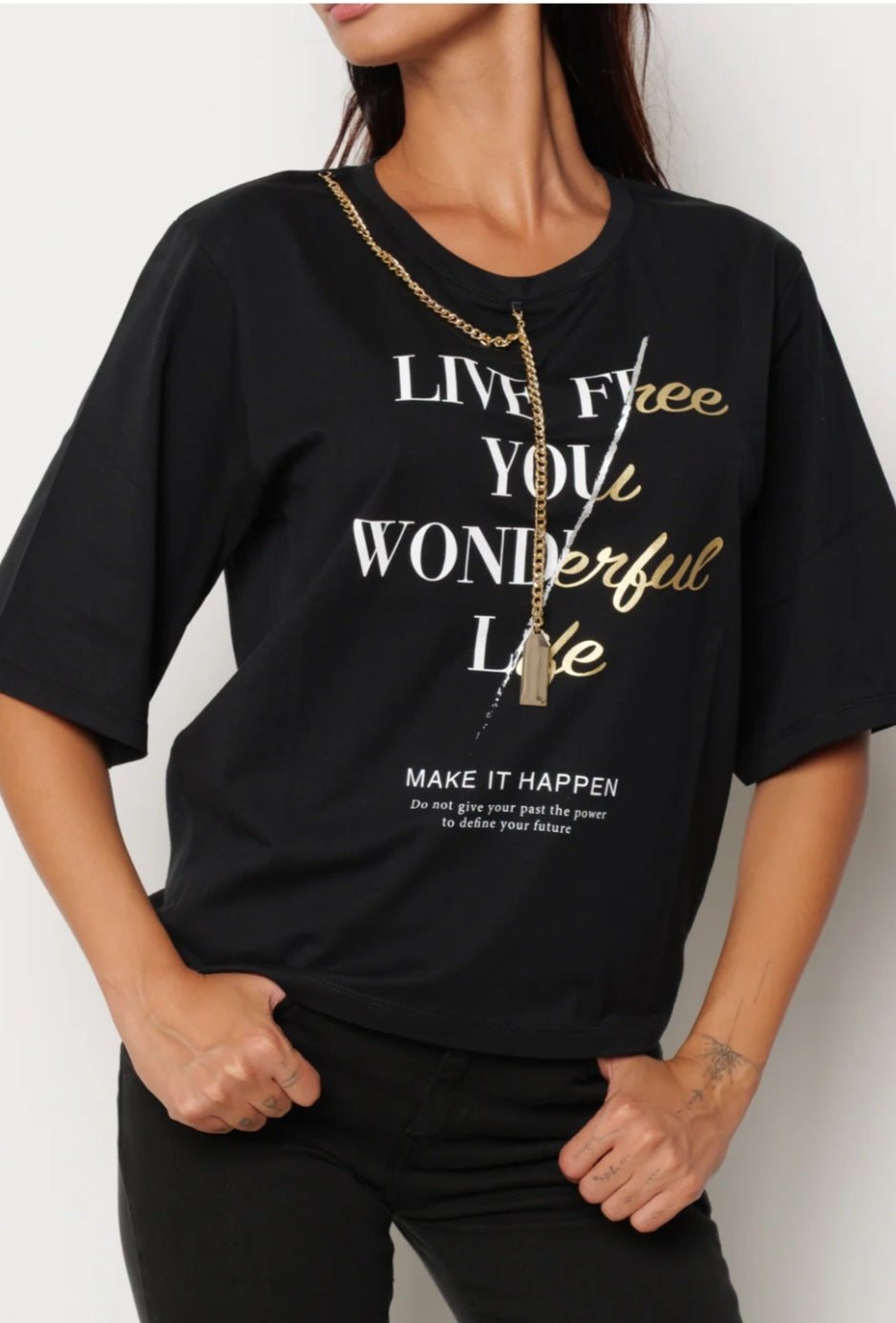 Una t-shirt che non passa inosservata: la HAPPEN a mezza manica unisce comfort e stile con dettagli unici. La catena decorativa e la placca logo in metallo le danno un’anima urban-chic, mentre la stampa grafica aggiunge personalità al look. Perfetta da abbinare a jeans, gonne o blazer per outfit decisi e contemporanei. Casual, sì, ma con carattere.