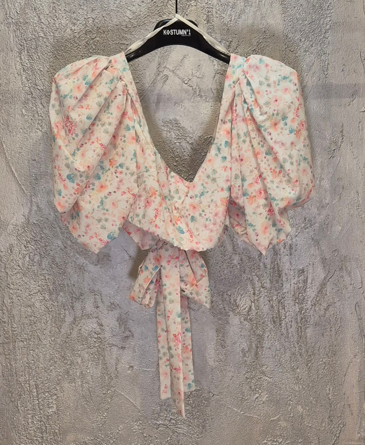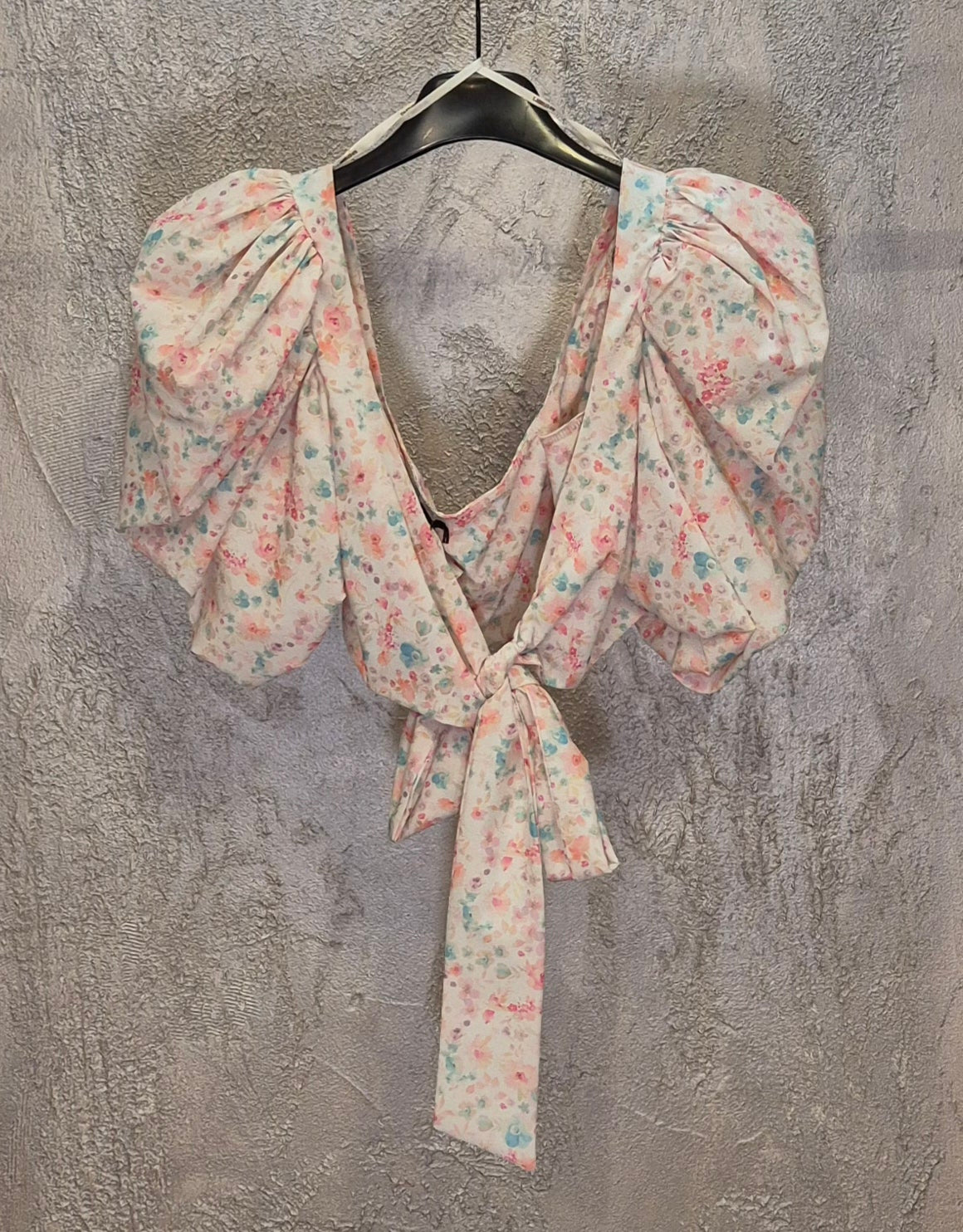 Top crop fantasia con manica a sbuffo e laccio sulla schiena.