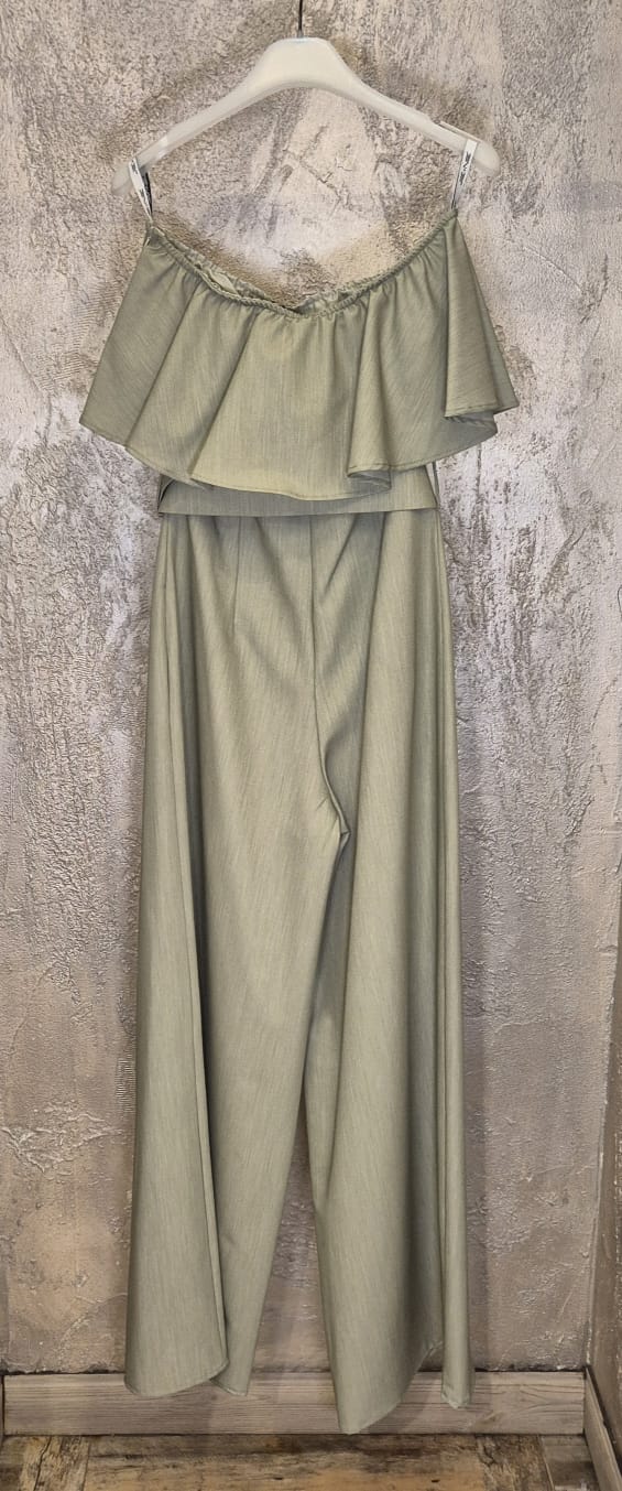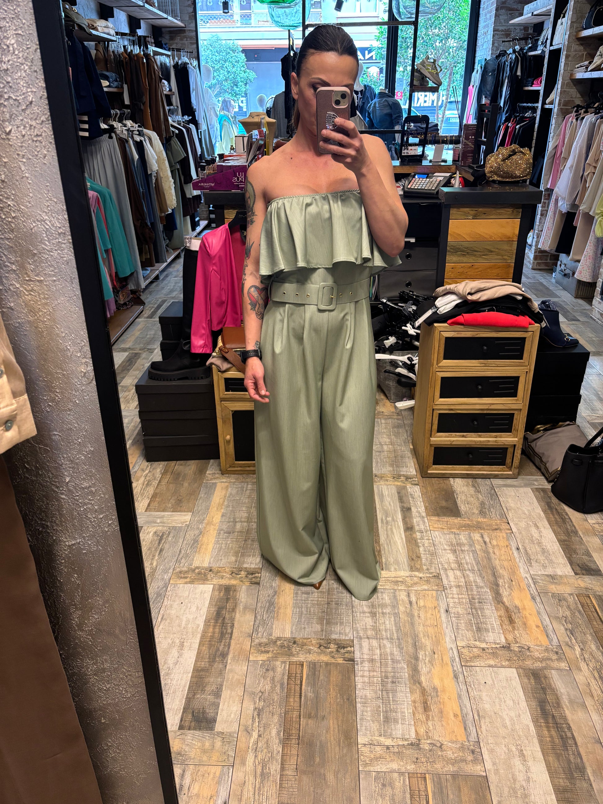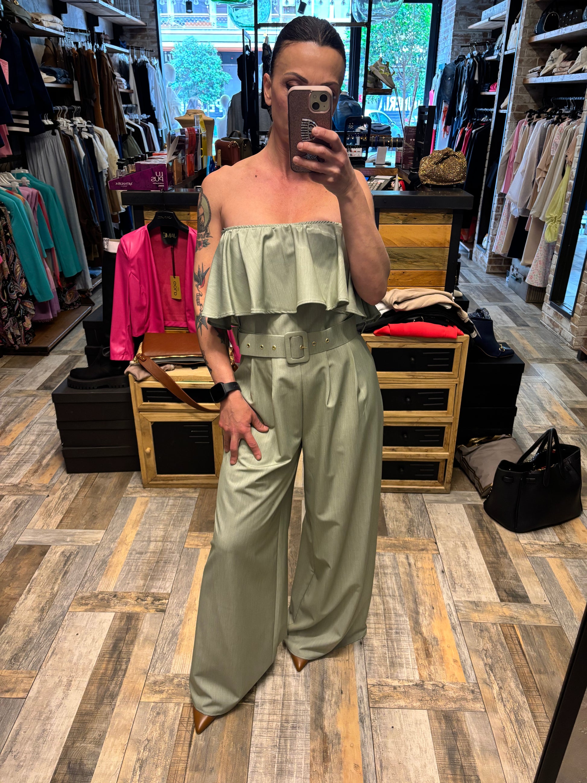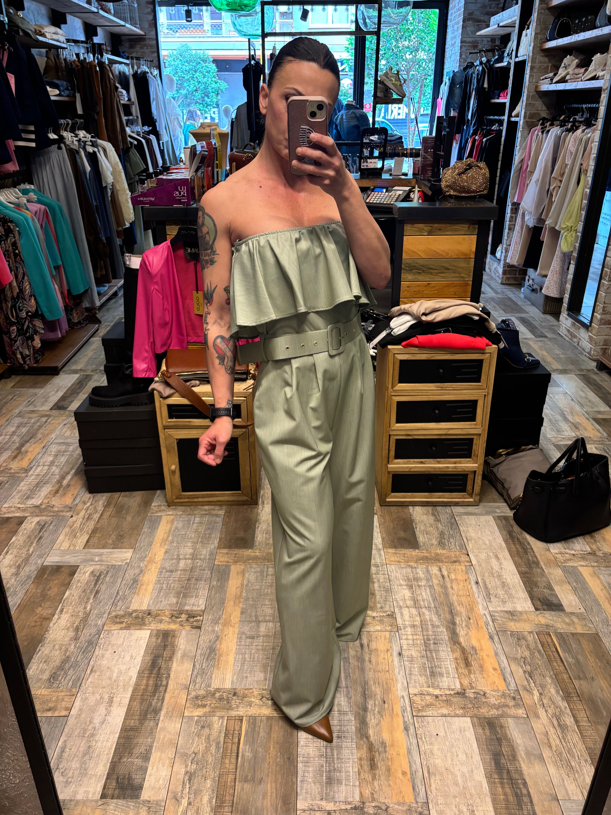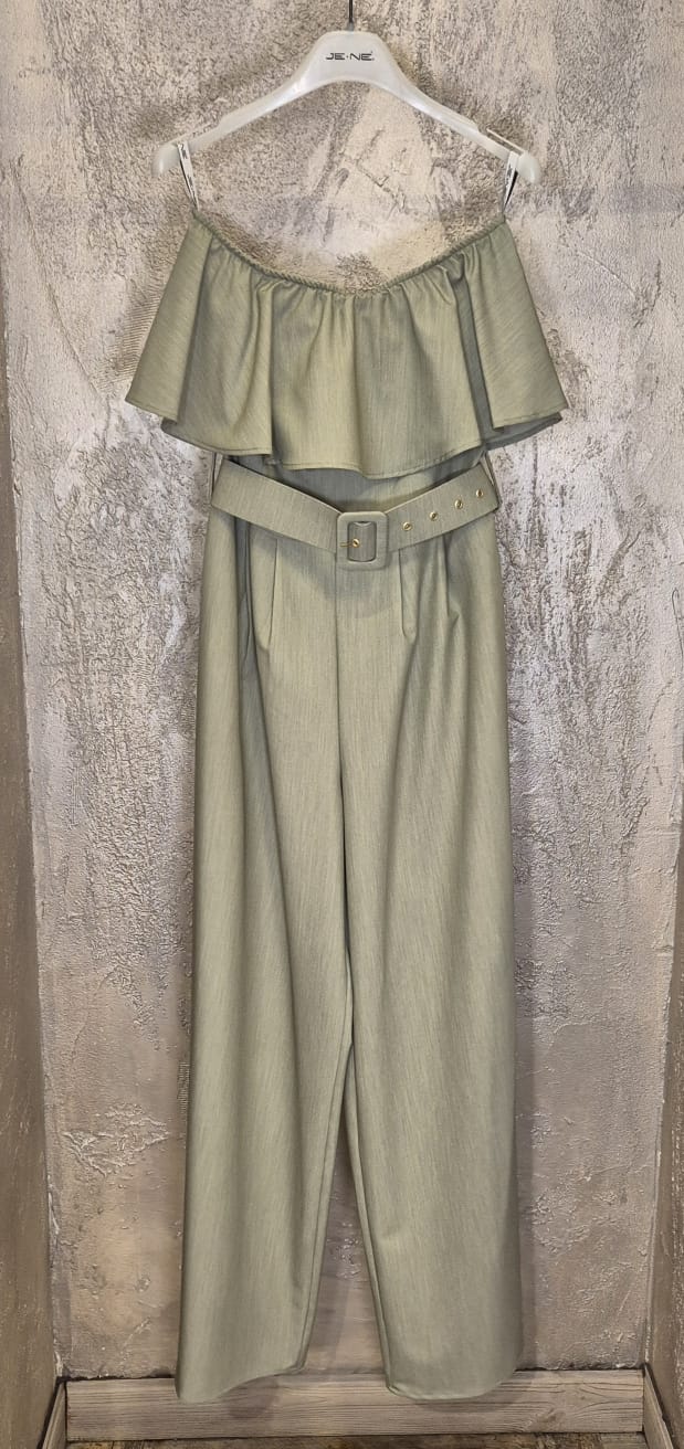 Tuta Jene’ lunga a palazzo con cinta in vita e pences sul davanti